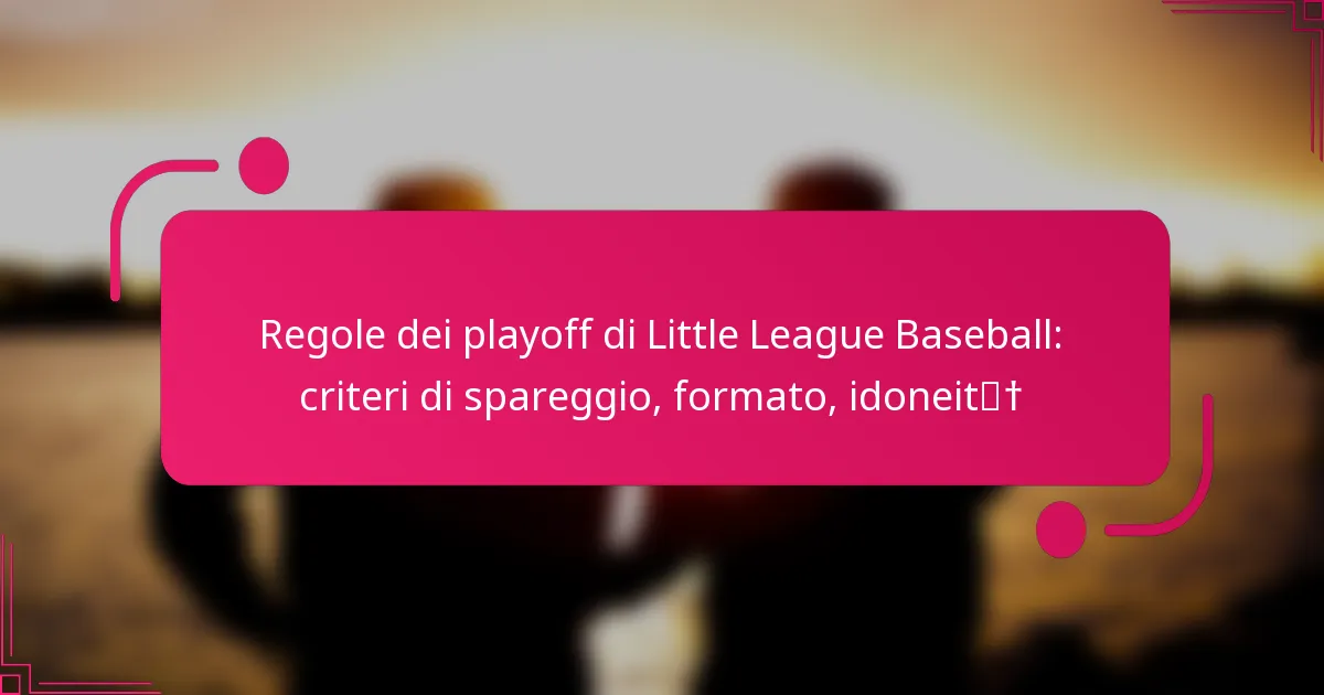 I playoff di baseball della Little League sono regolati da regole specifiche che riguardano l’idoneità, il formato dei playoff e le procedure di spareggio per mantenere una competizione equa. Gli spareggi sono cruciali per determinare il posizionamento nei playoff tra squadre con record identici, utilizzando criteri come i risultati testa a testa e il differenziale di punti. Il formato dei playoff può variare, presentando tipicamente strutture a eliminazione singola o doppia in base ai regolamenti della lega, con le squadre che si qualificano in base alle loro prestazioni nella stagione regolare.